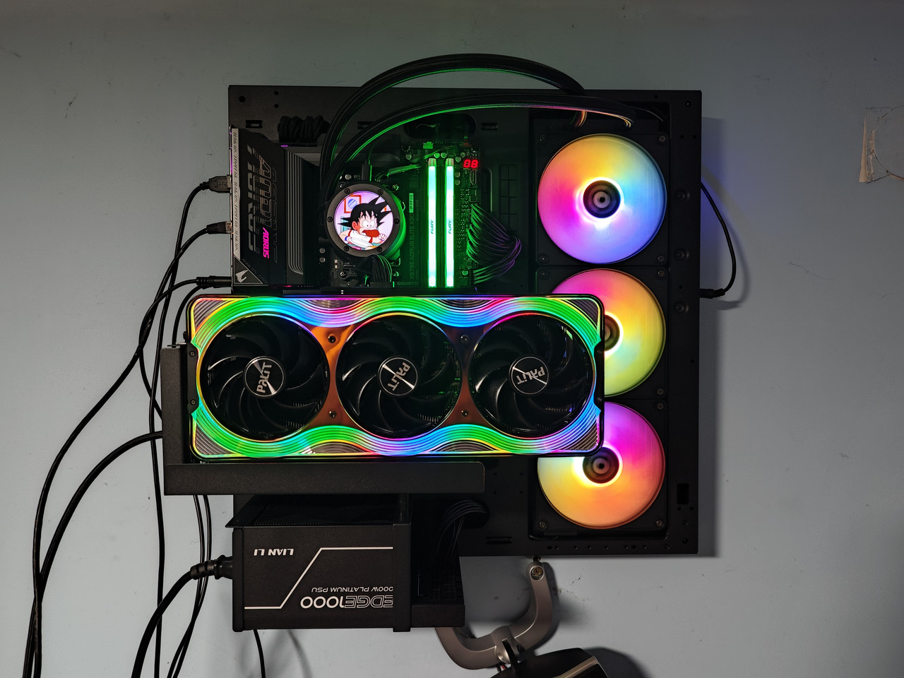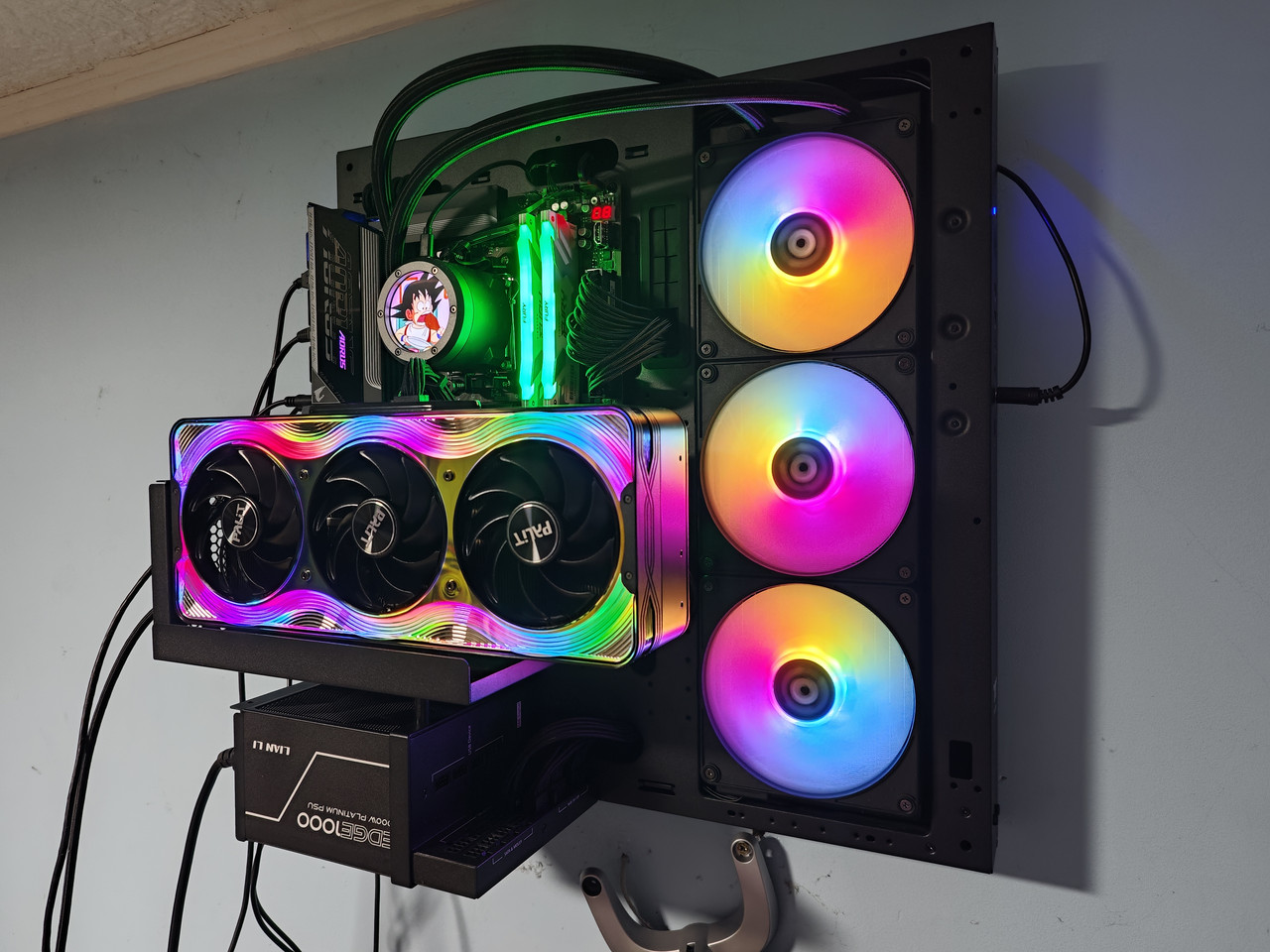 Ima par izmena u odnosu na početnu konfiguraciju, ploča i napjanje, na kraju sam uzeo x870e aorus elite x3d i lian li edge 1000W platinum, napjanje jako lepo izgleda sa svojim L dizajnom, ali ima užasno kratke kablovi ako želite da odradite bilo kakav cable managment, sve je zategnuto, takođe moraću da uzmem 90 stepeni 12vhpwr kabal, ovaj je sada jako savijen kod grafičke. Thermaltake AIO je gimik ali jako lepo izgleda, nisam milsio da će ugraditi ovako dobar ekran na njega, ppi i refresh rate nisu ništa lošiji u odnosu na neki jeftiniji telefon. Sve u svemu prezadovoljan sam kako je ispalo. Hvala još jednom VMARC za memoriju, inače bi mašina koštala još jedno 500e više :) Ignorišite pljave zidove itd. tu je bilo okačenih stvari, mrzelo me da čistim, samo sam hteo da okačim mašinu i vidim kako izgleda :D
